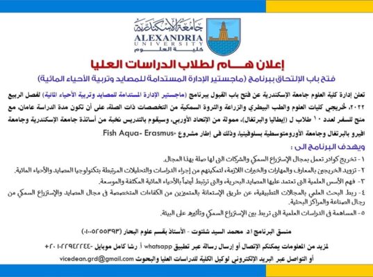 تعلن إدارة كلية العلوم، جامعة الإسكندرية، عن فتح باب القبول ببرنامج”ماجستير الإدارة المستدامة للمصايد وتربية الأحياء المائية لفصل الربيع، 2022.