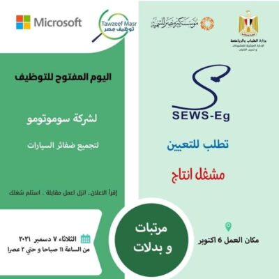 تعلن وزارة الشباب والرياضة الادارة المركزية للمشروعات وتدريب الشباب، الادارة العامة للمشروعات، بالتعاون مع شركة مايكروسوفت، عن تنفيذ اليوم المفتوح للتوظيف بشركة “سوموتومو” لتجميع ضفائر السيارات الثلاثاء 7 ديسمبر من الساعه 11ص لـ ساعه 3م.