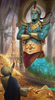 ضحك العفريت ومشى أمام الصياد، وقال: “أيها الصياد اتبعني”.