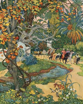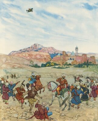 ثم نهض وأخذ معه جرابين من جواهر الزمرد والياقوت، ونفائس المعادن وسائر الأحجار الكريمة، وطلب من غلمانه حملها.
