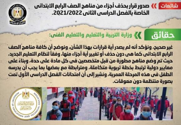 وتواصل المركز الإعلامي لمجلس الوزراء مع وزارة التربية والتعليم والتعليم الفني، والتي نفت تلك الأنباء.. مُؤكدةً أنه لا صحة لصدور قرار بحذف أجزاء من مناهج الصف الرابع الابتدائي الخاصة بالفصل الدراسي الثاني 2021/2022، وأنه لم يصدر أي قرارات بهذا الشأن.