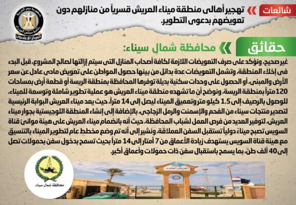 وقد تواصل المركز الإعلامي لمجلس الوزراء مع محافظة شمال سيناء، والتي نفت تلك الأنباء.. مُؤكدةً أنه لا صحة لتهجير أهالي منطقة ميناء العريش قسرياً من منازلهم دون تعويضهم بدعوى التطوير، مُشددة على صرف التعويضات اللازمة لكافة أصحاب المنازل التي سيتم إزالتها لصالح المشروع، قبل البدء في إخلاء المنطقة.